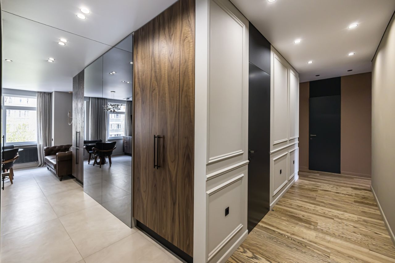 Прихожая: Шкаф большой в прихожей шпон Американский орех (Manacor), зеркала с подсветкой.