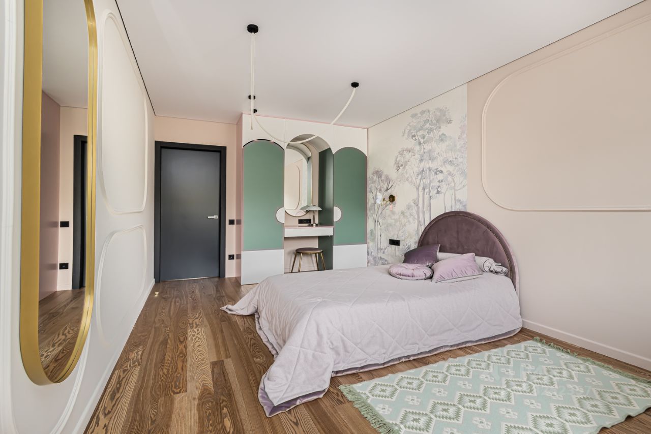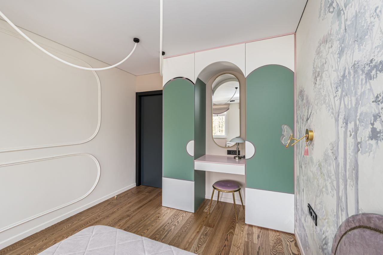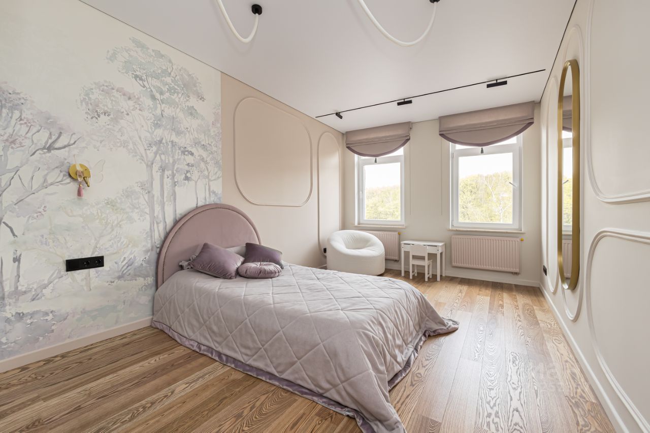 Детская девочки: Кровать с матрасом 190 на 120 Askona Шкаф большой - эмаль. 2 овальных зеркала Genglass 60*180, 51*136 Кресло вращающееся Luna букле Garda Decor Подоконники мрамор Текстиль (шторы, покрывало, подушки) и карнизы - Италия.