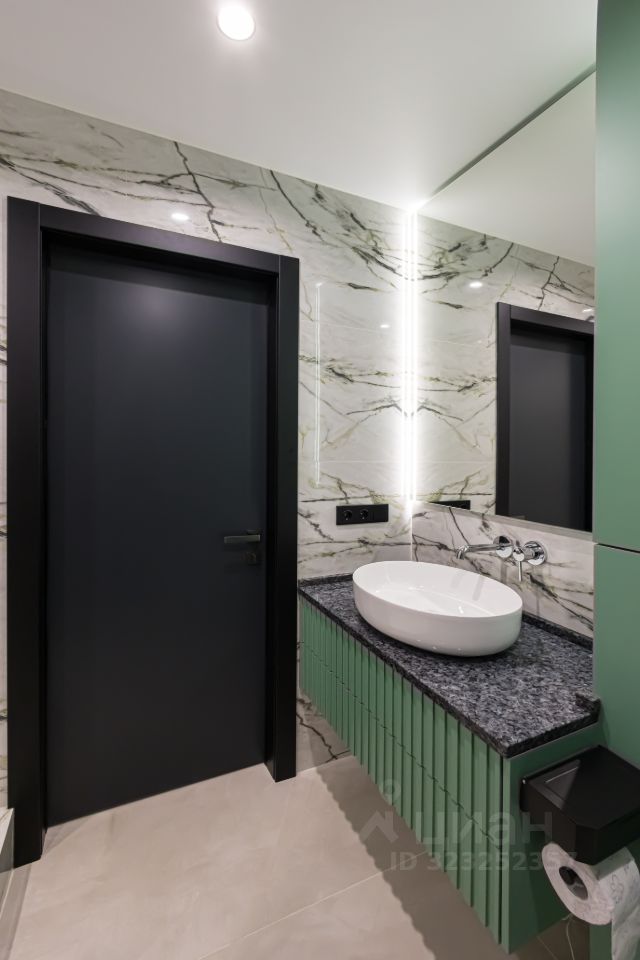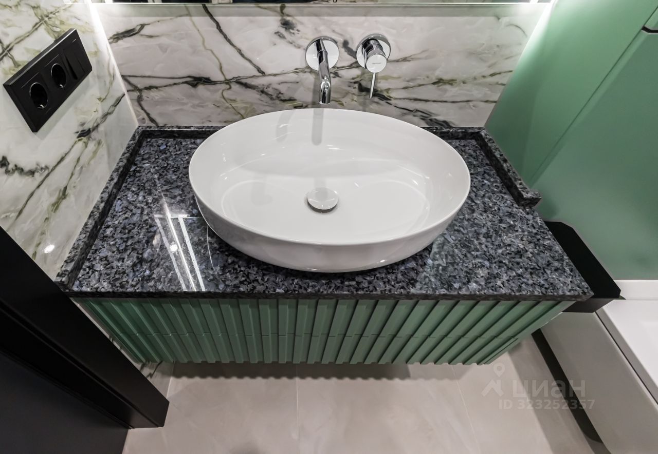 Ванная комната: Навесная тумба, настенная панель, шкаф - все эмаль Зеркало с подсветкой Столешница для раковины Blue pearl гранит Сантехника итальянская. Плитка производство Италия.