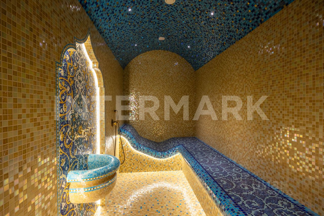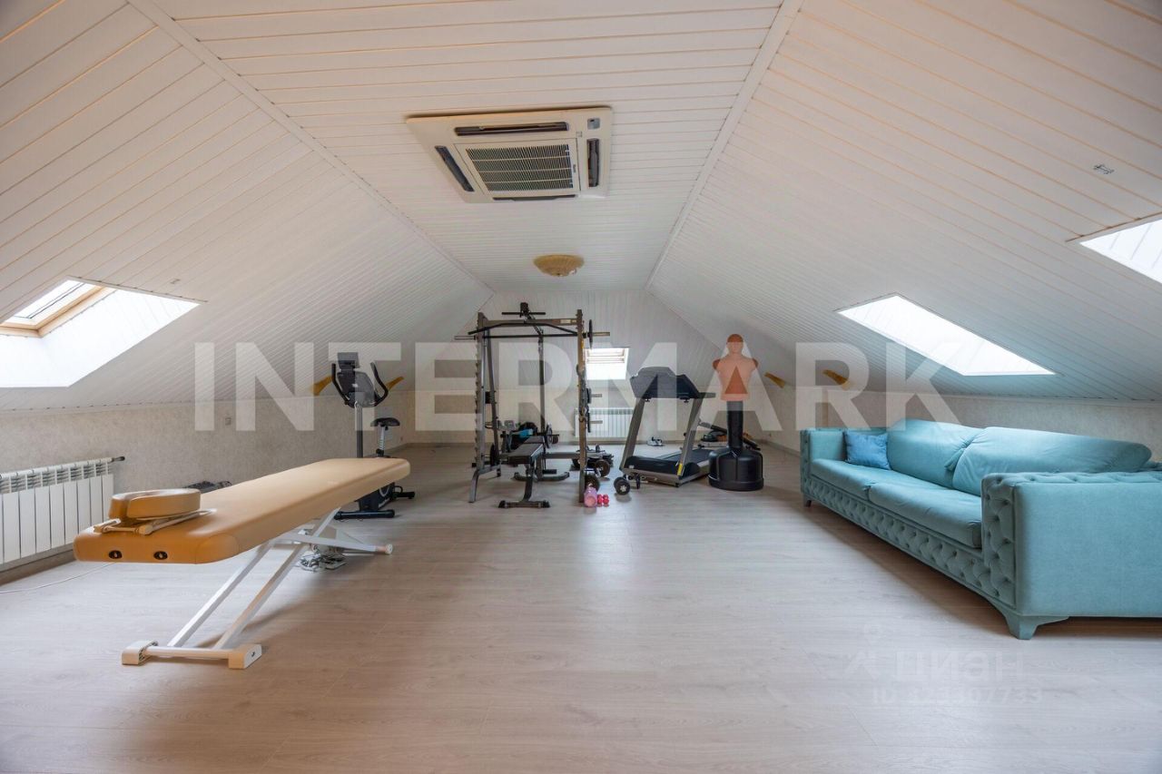 Планировка дома: 1 этаж: прихожая, холл, гардеробная, гостиная с камином, просторная кухня с зоной для завтрака, столовая с выходом на участок, комната отдыха с камином, хамам с душевой, гостевой санузел, постирочная, гараж на 2 м/м, 2 этаж: холл-галерея, спальня с ванной комнатой и балконом, спальня с гардеробной и балконом, детская спальня, ванная комната, гардеробная комната, мансарда: зонированное пространство для спорта и отдыха.