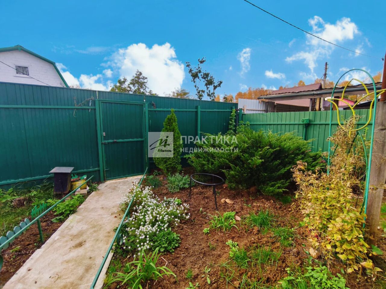 Высажены плодовые кусты, взрослые деревья, очень много цветов.