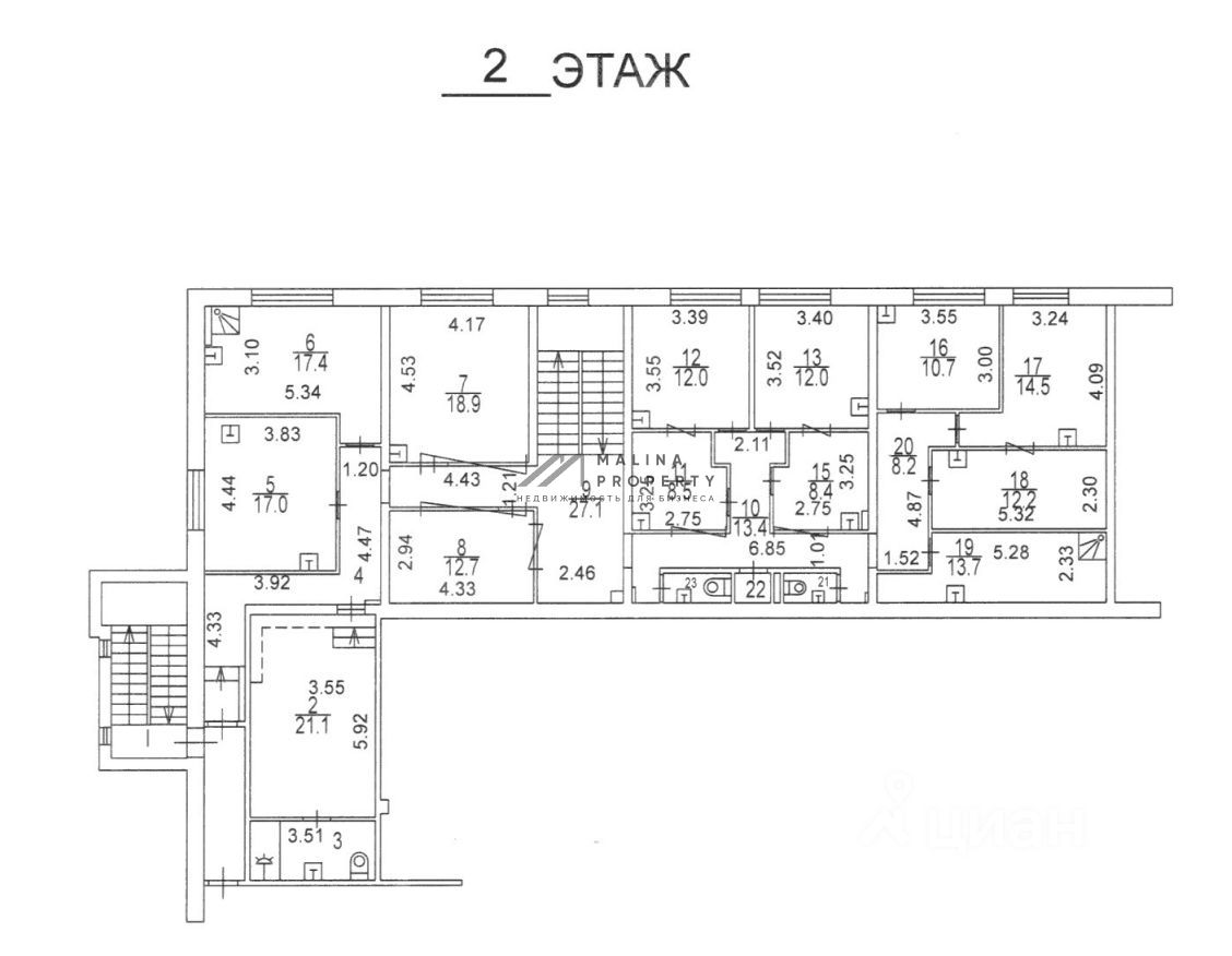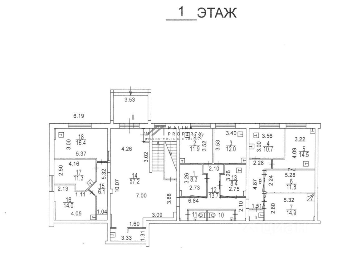 Помещение общей площадью 490 м2, располагается на 1 и 2 этаже, кабинетная планировка, предусмотрена душевая, отдельный вход с фасада и со двора, высота потолка 3 м, витринные окна по фасаду. Электрическая мощность 80 кВт. Парковка перед фасадом. Место для размещения рекламы.