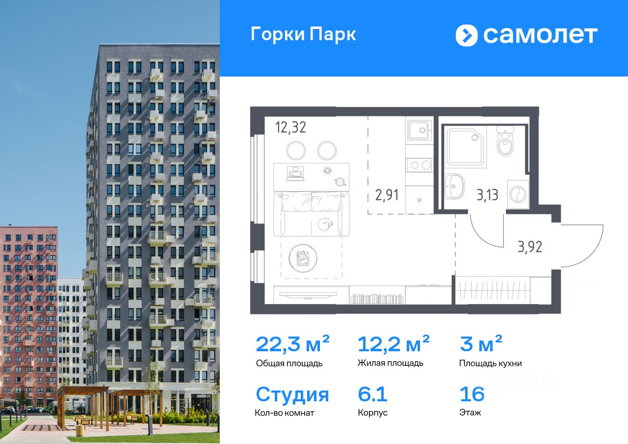 Строим кварталы для жизни с заботой о будущем. Предлагается квартира студия комфорт-класса 22,28 кв.м в корпусе 6.1 на 16 этаже, в ЖК ''Горки Парк'' Квартира без отделки. Доступность опции ''отделка'' и возможность комплектации мебелью и декором уточняйте у застройщика.