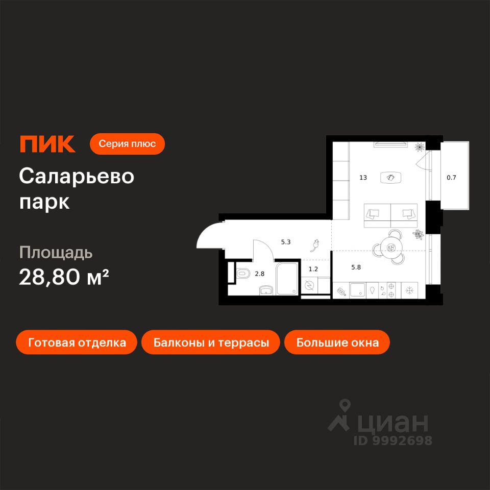 Продаётся квартира-студия площадью 28,8 кв.м на 2 этаже 24 этажного дома (Корпус 82.8, Секция 8) проекта ПИК Саларьево парк. Светлый просторный подъезд на уровне земли, функциональная планировка, большие окна, c отделкой.