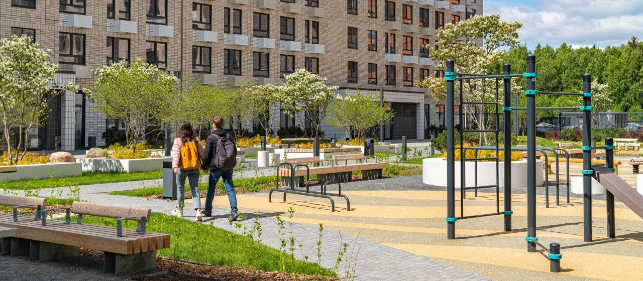 Все корпуса в квартале гармонично сочетаются, образуя единую городскую среду. Между собой их объединяет невысокая этажность и натуральная цветовая гамма. Здесь приятно гулять и проводить время на улице всей семьёй.