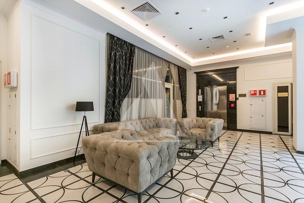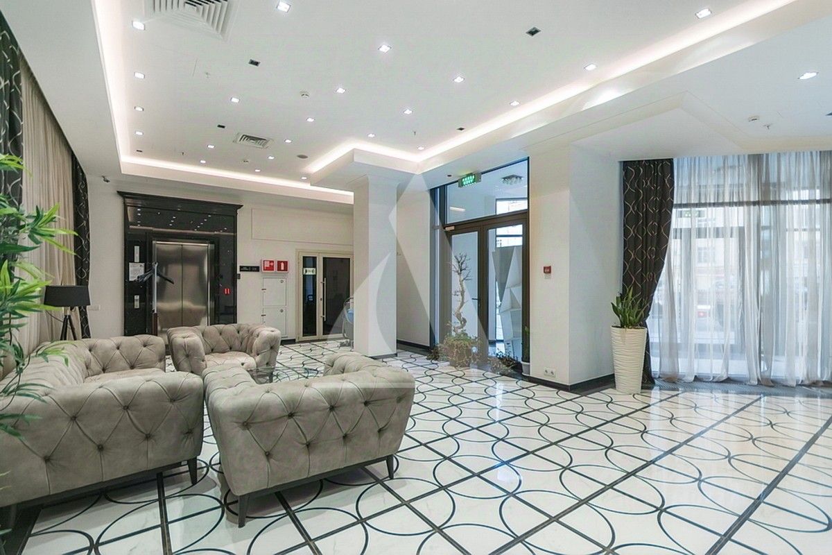 Апартамент отличается высокими потолками и панорамными окнами с видом на благоустроенный внутренний двор с эксклюзивным ландшафтным дизайном. Во дворе отсутствуют автомобили, что обеспечивает полную тишину и безопасность.