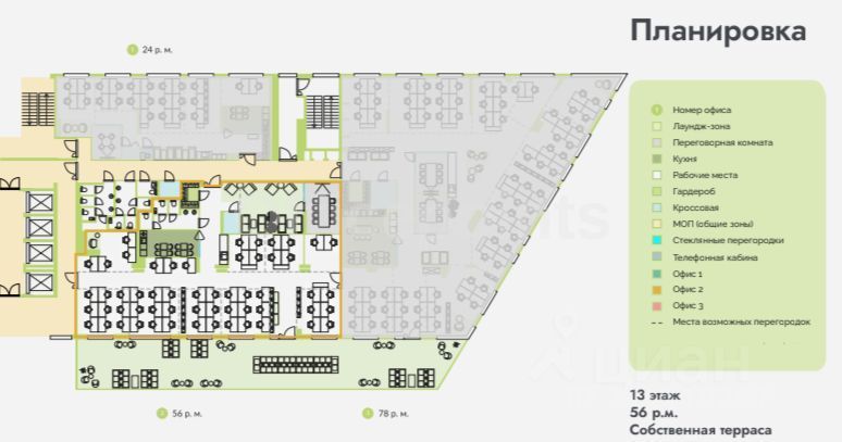 56 рабочих мест. В аренду включены: коммунальные платежи, мелкий ремонт, мебель, копировальная техника и бумага, клининг, кофе поинт, озеленение, ресепшн, СКУД и видеонаблюдение.
