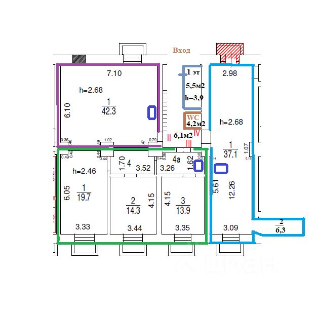 Легко можно разделить на 3 помещения со своими санузлами (см. схему).