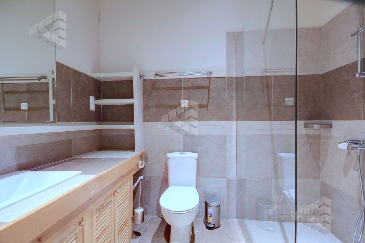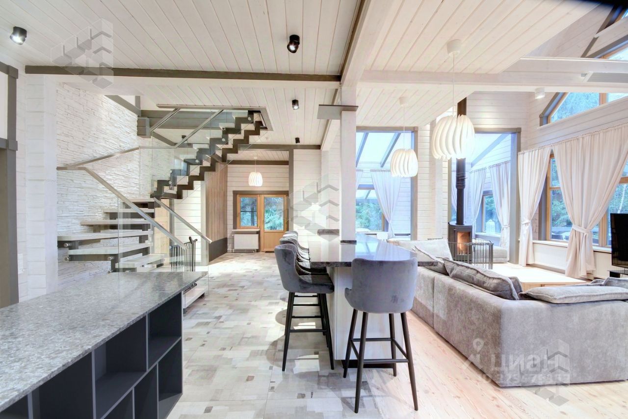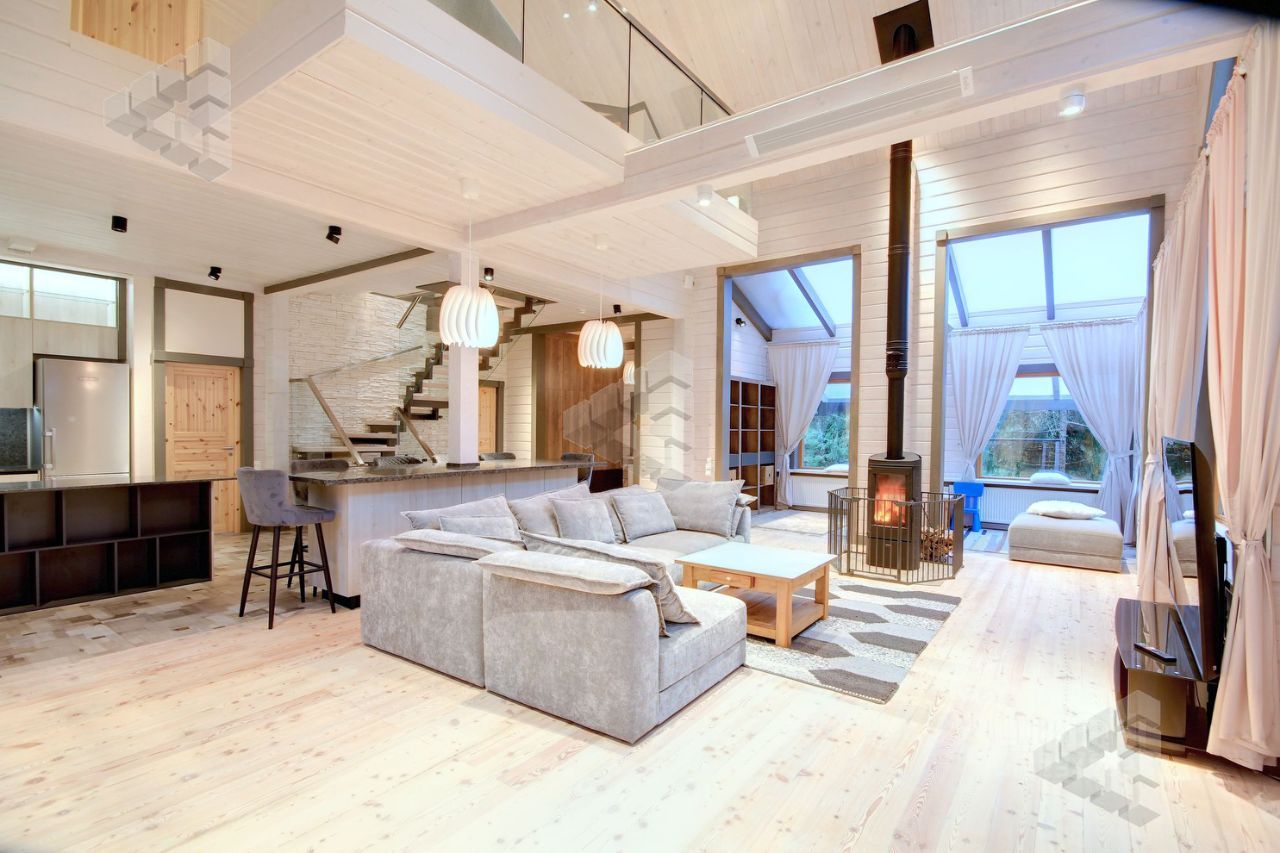 1 этаж: холл, гостиная с камином, столовая, кухня, гостевая спальня, спальня-кабинет, 2 санузла, гардеробная, кладовая, прачечная, сауна, котельная, выход 3 террасы, 2 этаж: 3 спальни каждая имеет выходом на балкон, 3 санузла, уютный холл,