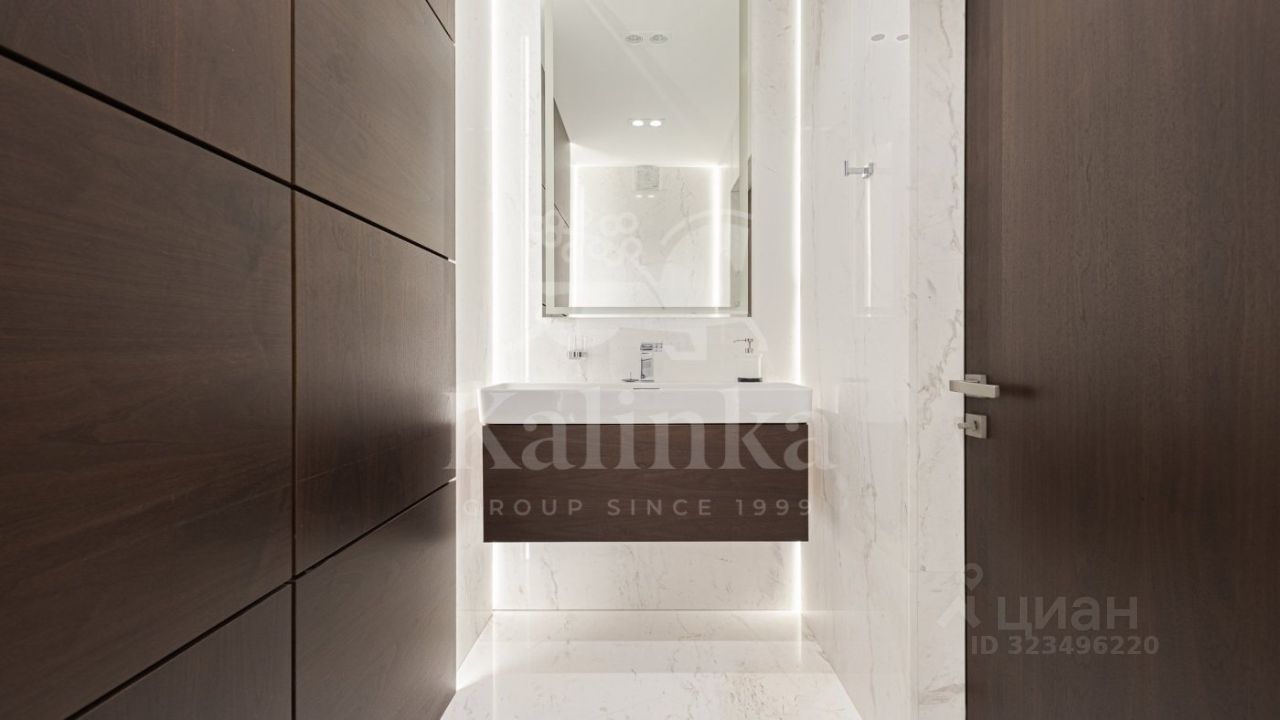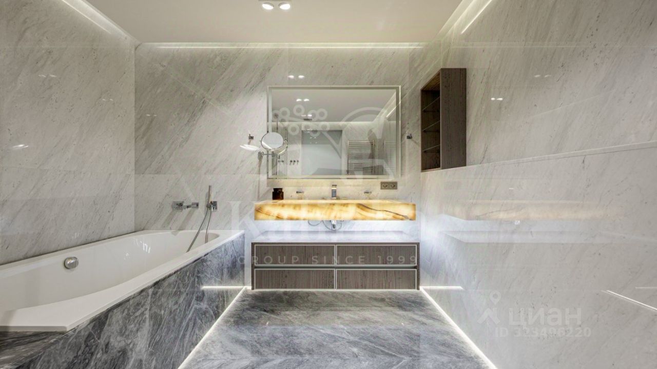 Интерьер квартиры отражает роскошь натуральных материалов: благородный шпон ореха в отделке, паркет из ореха, мрамор из Испании и Италии. Особого внимания заслуживают дизайнерские акценты — панно из оникса в гостиной и раковины из оникса. Сантехника бренда Keuco, ванная и раковина от Villeroy.