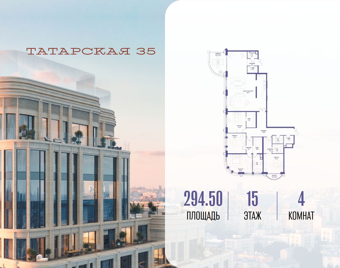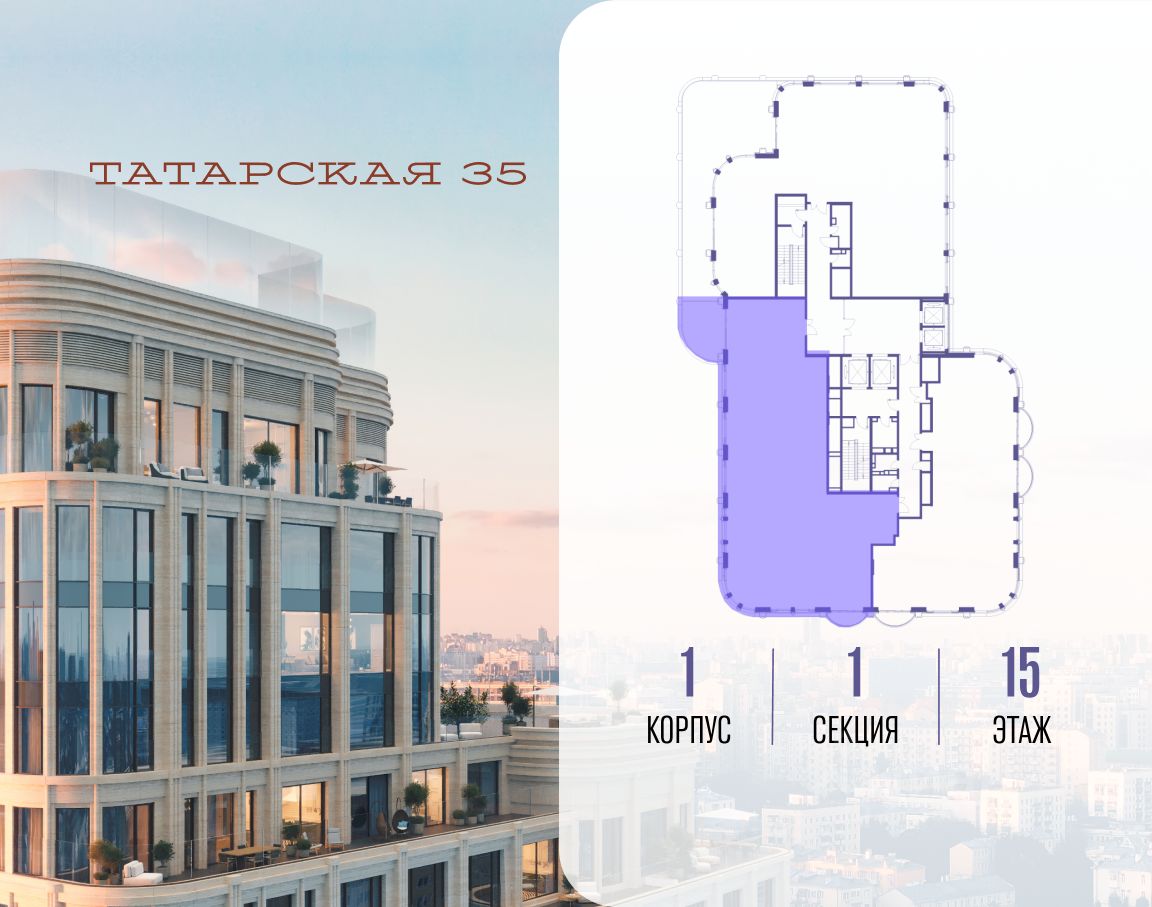 ТАТАРСКАЯ, 35 - новая архитектурная доминанта Замоскворечья, достопримечательность на фотопанорамах исторического центра Москвы. Элитный дом, созданный для тех, кто умеет смотреть далеко вперед, мыслить масштабно и воплощать собственный сценарий жизни.