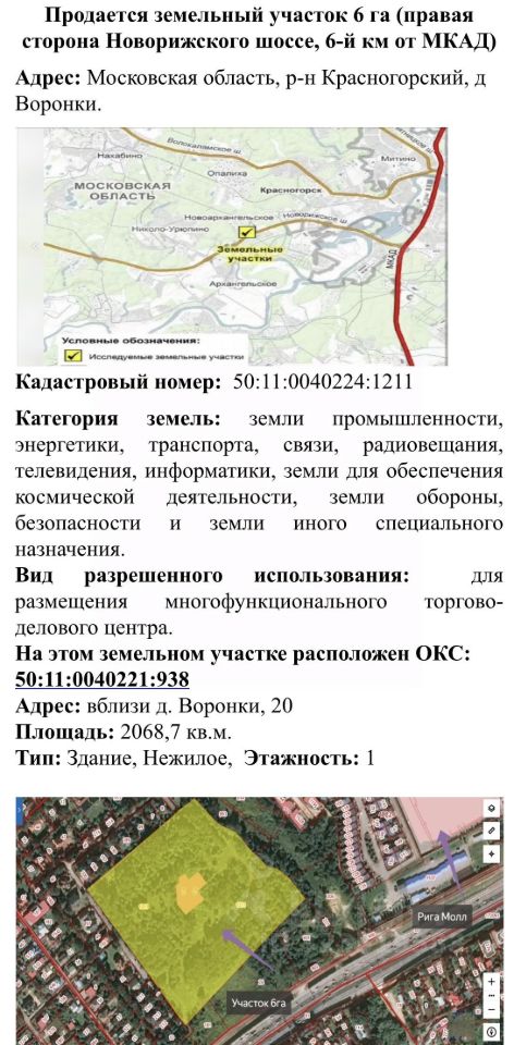 Уважаемые господа! Вашему вниманию представляется участок 5,83 га и вариативный проект под застройку Агро Бизнес Центра : Фуд Сити Рига Мол или ЖК/ТРК. или ДАТА ЦЕНТР в Подмосковье в районе Новой Риги, ( 6 км от МКАД) правая вечерняя сторона в область. Важно , на соседнем участке 20 мгвт электричества! закончены работы по строительству съезда -выезд с Новой Риги,энергоресурс 1.5 мгвт на соседнем участке с увеличением до 3 Мгвт Есть точка подключения воды, точка сброса канализации. Напротив, через Новорижское шоссе находится Глобус, и соответственно, когда люди едут домой в область у них нет возможности справа купить продукты, поэтому большая пробка на разворот и обратно. Газ проходит по границе участка, также рядом 2 коттеджных поселка Новая Рига (6 км от МКАД) правая, вечерняя сторона. Стоимость участка 1 млрд 550 миллионов рублей документы готовы