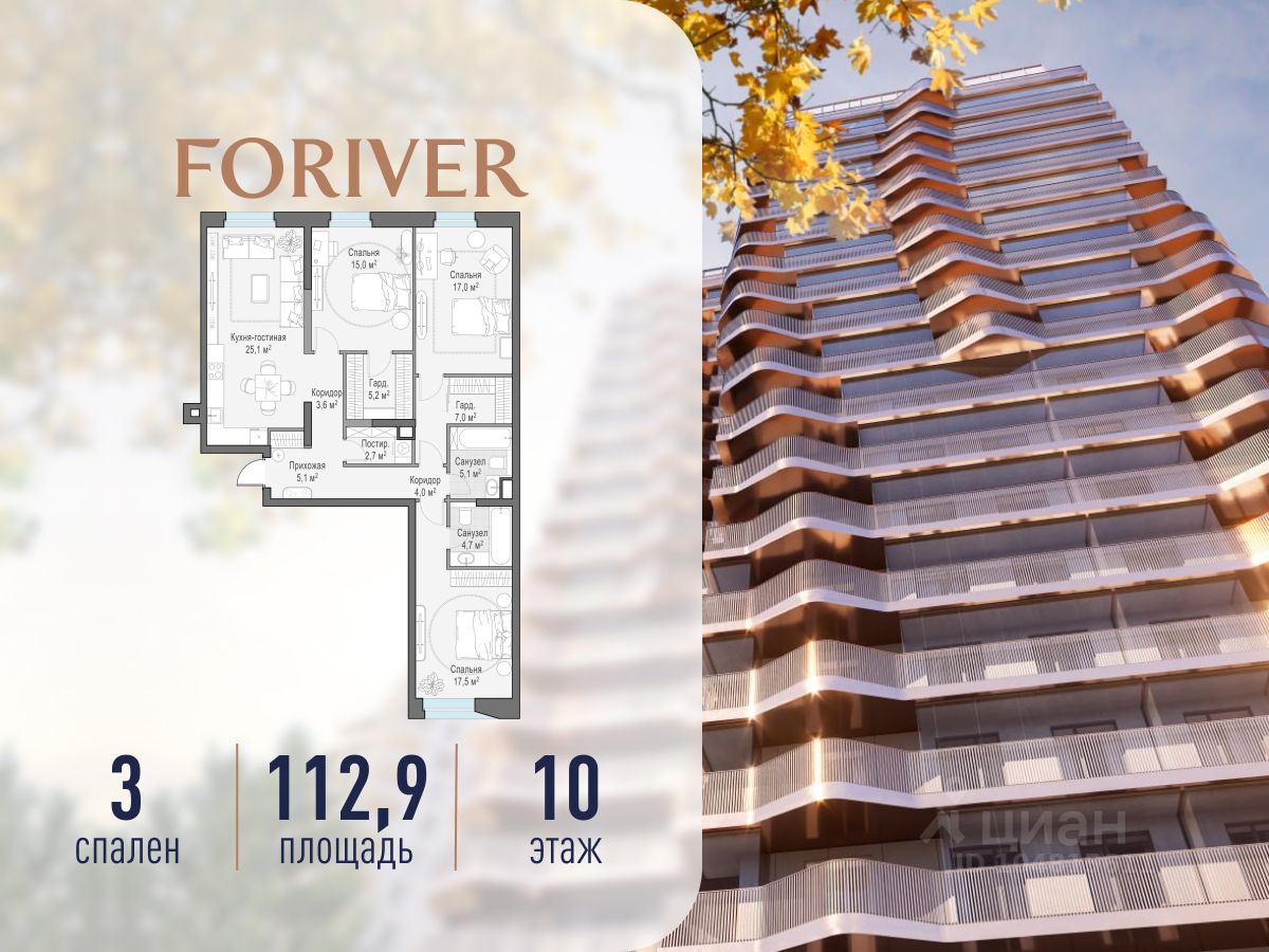 Прямая продажа от застройщика. В жилом квартале, расположенном в Даниловском районе Москвы, продаётся 3-комнатная квартира площадью 112.90 кв.м без отделки. Квартира расположена на 10 этаже 12-этажного дома, корпус Line 9, в жилом квартале бизнес-класса Foriver.
