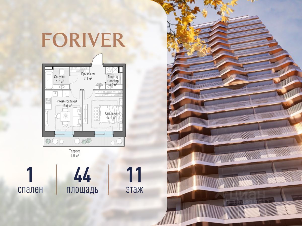Прямая продажа от застройщика. В жилом квартале, расположенном в Даниловском районе Москвы, продаётся 1-комнатная квартира площадью 44.00 кв.м без отделки. Квартира расположена на 11 этаже 14-этажного дома, корпус Line 8, в жилом квартале бизнес-класса Foriver.