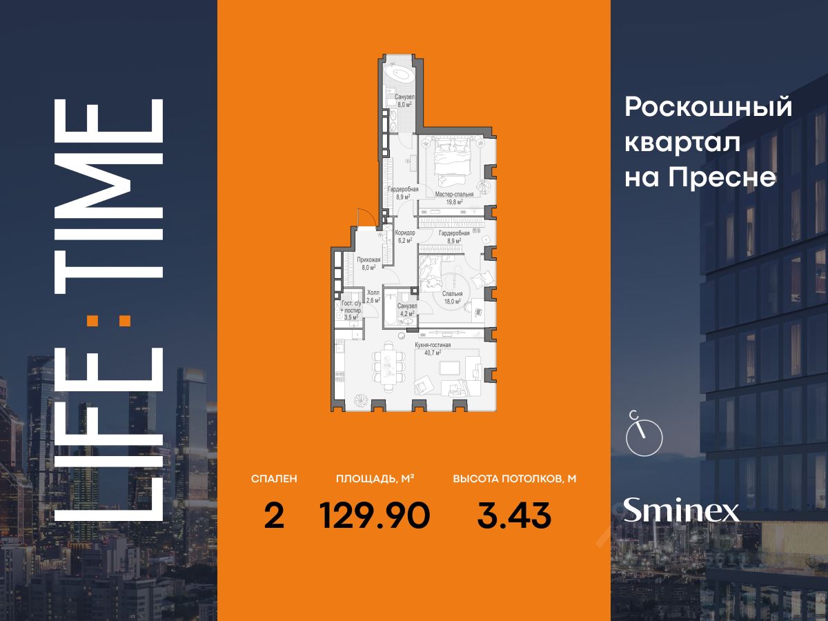 Life Time - роскошный современный квартал на Пресне, в наиболее быстро растущем премиальном районе ЦАО. Его насыщенная инфраструктура и выгодное расположение дарят время для жизни. Вы больше не тратите его на дорогу или ожидание, при этом ни в чём себе не отказывая. На территории предусмотрено всё для комфортной жизни: • двор-парк площадью 1,8 гектара с прудом и фонтанами, • Clubhouse - инфраструктурный центр в отдельном здании с исчерпывающими возможностями для спорта, отдыха и досуга только для жителей, • спортивная инфраструктура на улице и в помещении, в том числе бассейн длиной 25 метров, хот-таб, хаммам, сауна, бьюти-зона, • клубная гостиная с террасой, • всё для развития и досуга детей любого возраста, в том числе детский сад и школа. Life Time находится в центре сложившегося премиального района, в окружении многочисленных парков. Удобная транспортная доступность и прямой выезд на Звенигородское шоссе позволяют без проблем добраться до Садового кольца и Москва-Сити. Архитектурный стиль квартала - роскошный минимализм. Дома десятилетиями будут выглядеть современно.