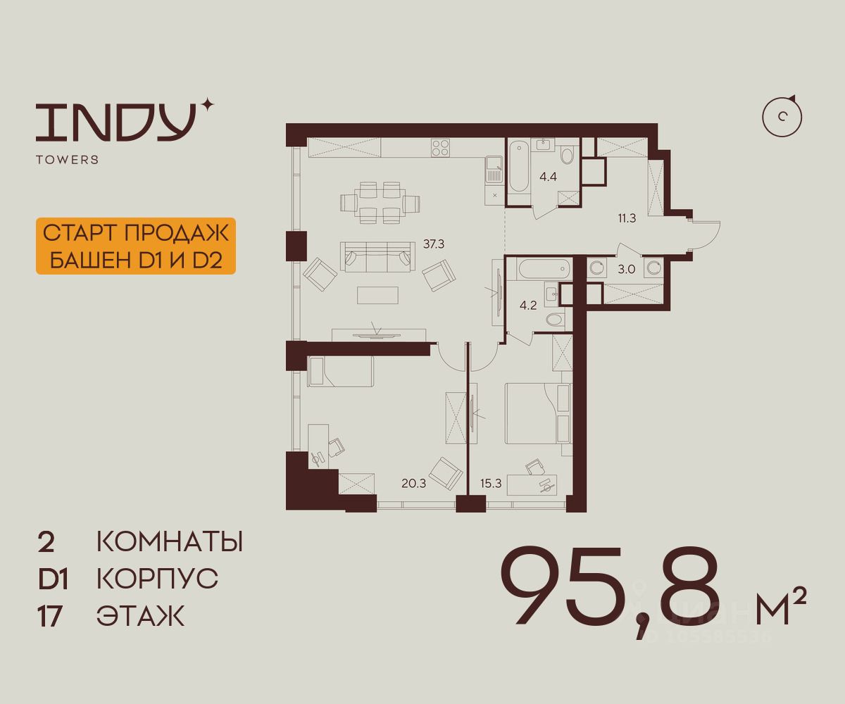 Продажа от застройщика. Продается просторная 2-комнатная квартира на 17 этаже жилого комплекса Indy Towers. Срок сдачи: 3 кв. 2029 г.