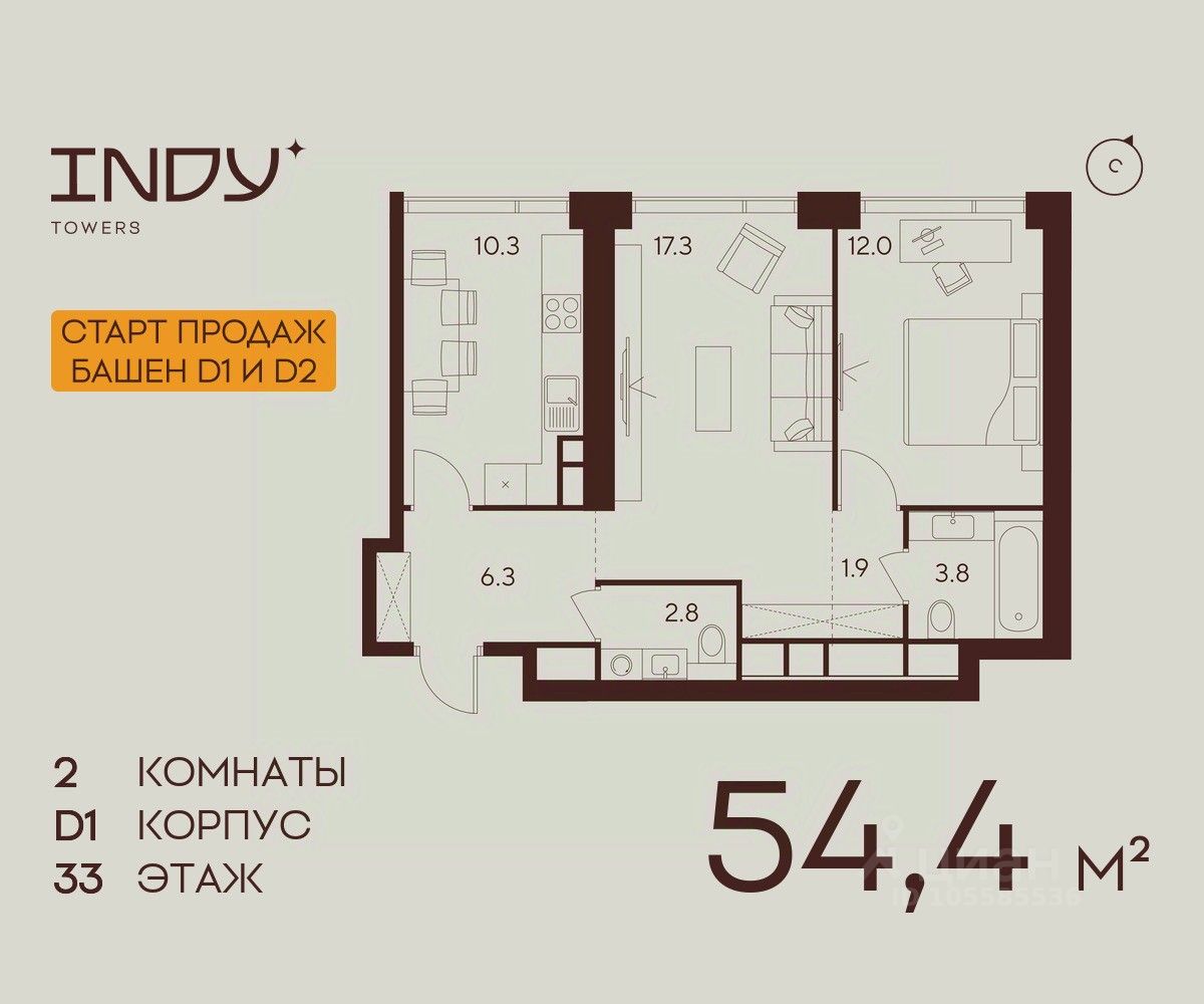 Продажа от застройщика. Продается 2-комнатная квартира на 33 этаже жилого комплекса Indy Towers. Срок сдачи: 3 кв. 2029 г.