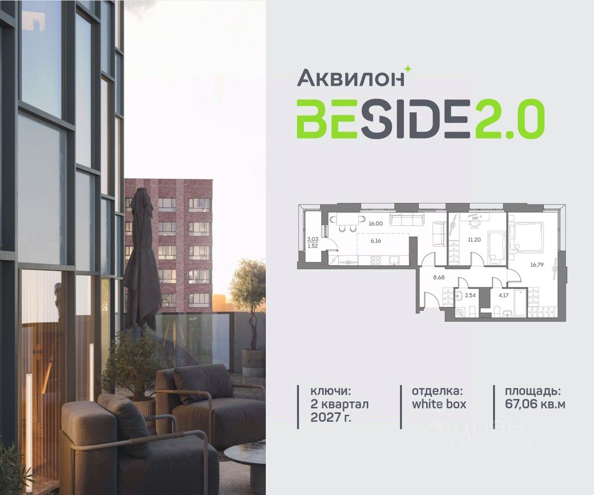 Продажа от застройщика. Продается просторная 2-комнатная квартира на 24 этаже современного жилого комплекса Beside 2.0. Вид из окон: на улицу. Срок сдачи: 2 кв. 2027 г. Квартира с лоджией.