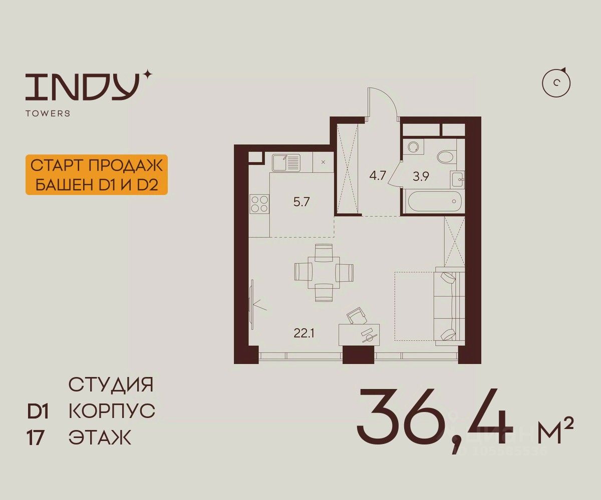 Продажа от застройщика. Продается просторная студия на 17 этаже жилого комплекса Indy Towers. Срок сдачи: 3 кв. 2029 г.