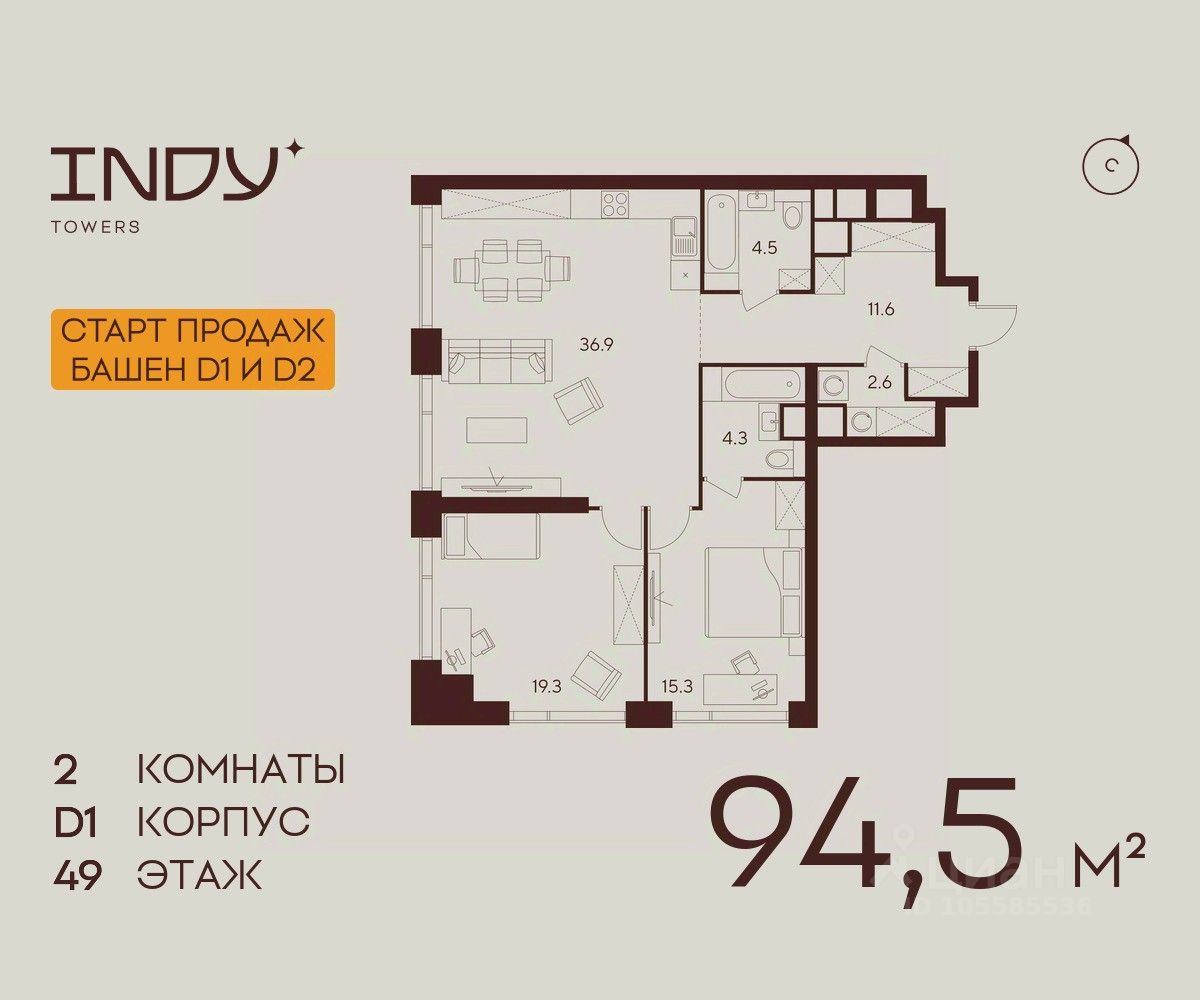 Продажа от застройщика. Продается просторная 2-комнатная квартира на 49 этаже жилого комплекса Indy Towers. Срок сдачи: 3 кв. 2029 г.