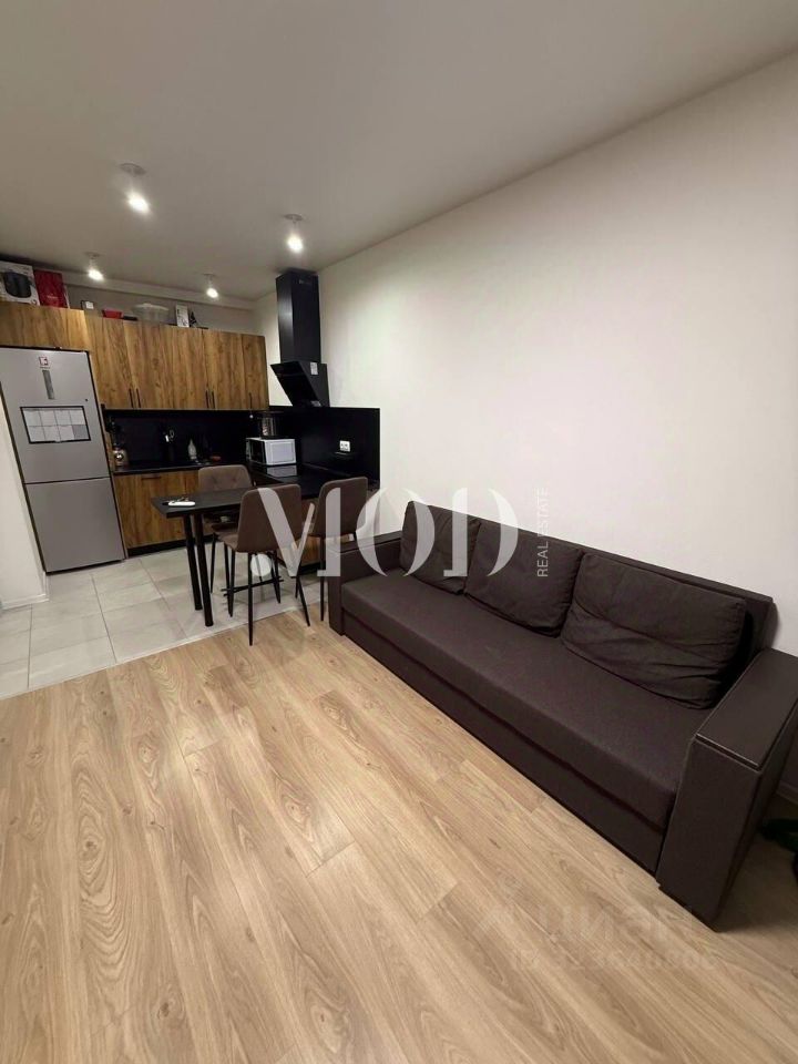 В зоне кухни-гостиной - встроенная мебель со встроенной бытовой техникой, включающей посудомоечную машину, вытяжку, холодильник, которые остаются новому владельцу этой квартиры.