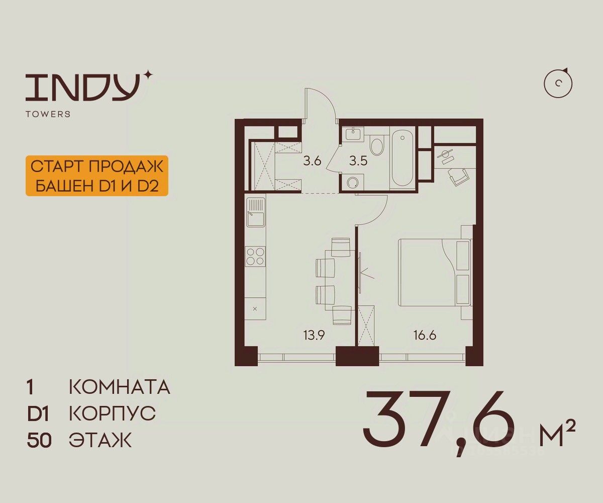 Продажа от застройщика. Продается уютная однокомнатная квартира на 50 этаже жилого комплекса Indy Towers. Срок сдачи: 3 кв. 2029 г.