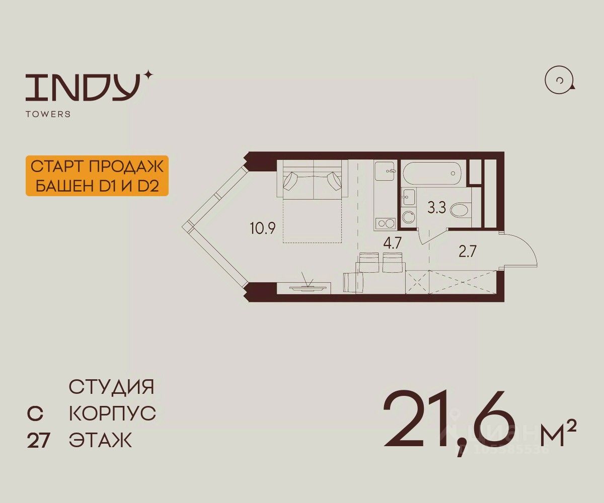 Продажа от застройщика. Продается просторная студия на 27 этаже жилого комплекса Indy Towers. Вид из окон: во двор. Срок сдачи: 4 кв. 2026 г.