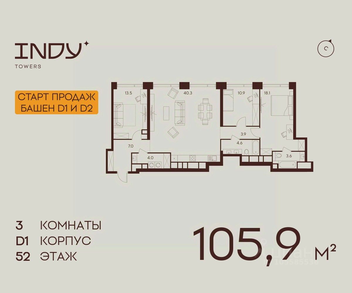 Продажа от застройщика. Продается просторная 3-комнатная квартира на 52 этаже жилого комплекса Indy Towers. Срок сдачи: 3 кв. 2029 г.