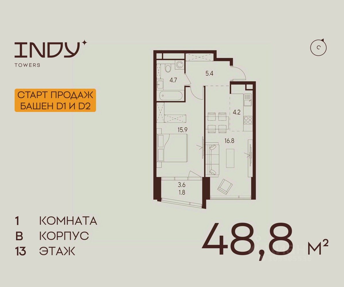 Продажа от застройщика. Продается уютная однокомнатная квартира на 13 этаже жилого комплекса Indy Towers. Вид из окон: во двор. Срок сдачи: 4 кв. 2026 г. Квартира с лоджией.