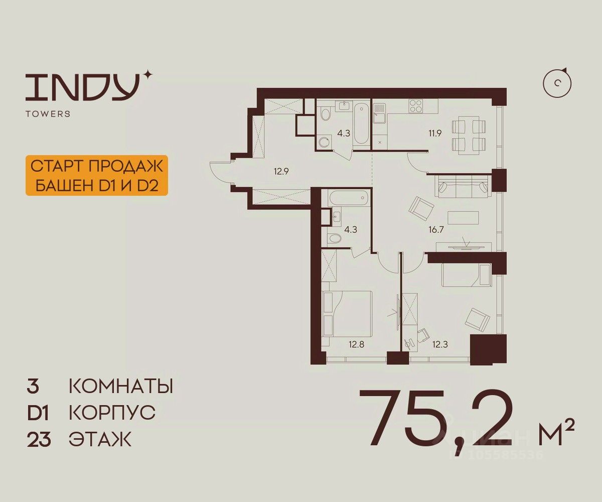 Продажа от застройщика. Продается просторная 3-комнатная квартира на 23 этаже жилого комплекса Indy Towers. Срок сдачи: 3 кв. 2029 г.