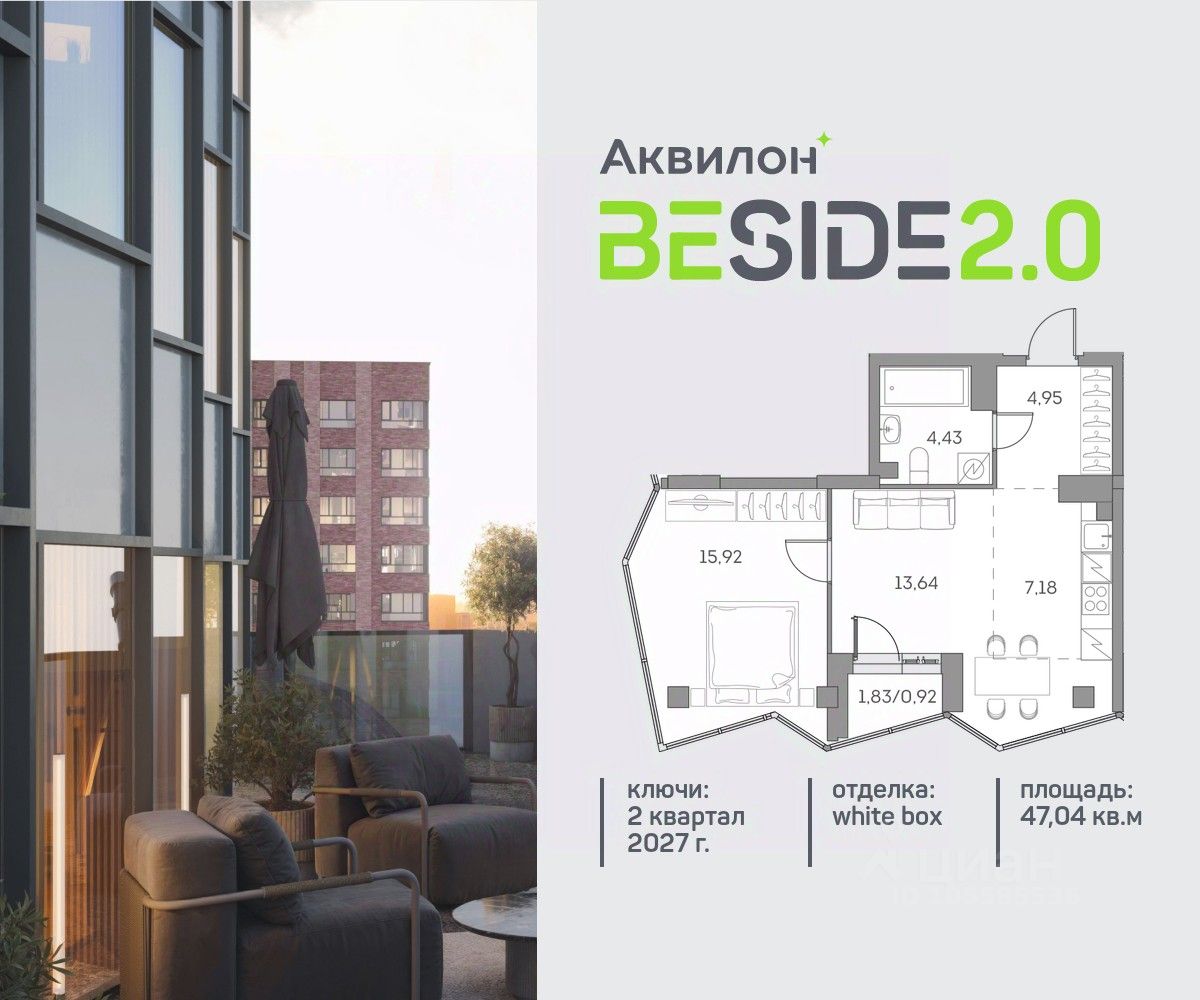 Зимний ЦЕНОпад. На данный лот распространяется скидка, которая действует только в феврале! Продажа от застройщика. Продается уютная однокомнатная квартира на 23 этаже современного жилого комплекса Beside 2.0. Вид из окон: во двор. Срок сдачи: 2 кв. 2027 г. Квартира с лоджией.