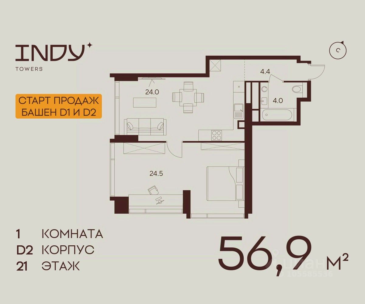 Продажа от застройщика. Продается уютная однокомнатная квартира на 21 этаже жилого комплекса Indy Towers. Срок сдачи: 3 кв. 2029 г.