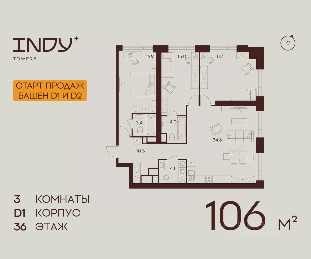Продажа от застройщика. Продается просторная 3-комнатная квартира на 36 этаже жилого комплекса Indy Towers. Срок сдачи: 3 кв. 2029 г.