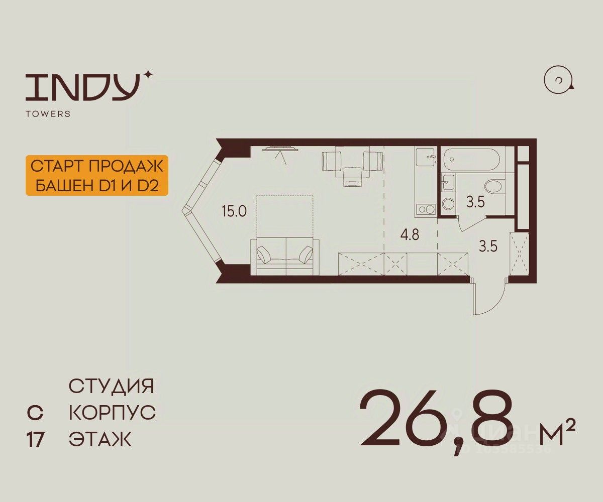 Продажа от застройщика. Продается просторная студия на 17 этаже жилого комплекса Indy Towers. Вид из окон: во двор. Срок сдачи: 4 кв. 2026 г.