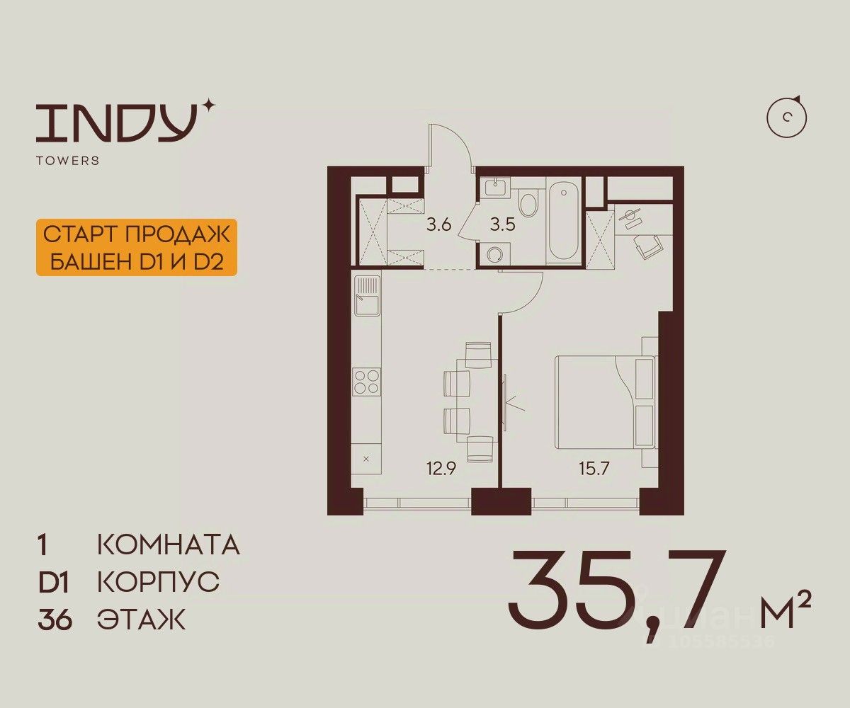 Продажа от застройщика. Продается уютная однокомнатная квартира на 36 этаже жилого комплекса Indy Towers. Срок сдачи: 3 кв. 2029 г.