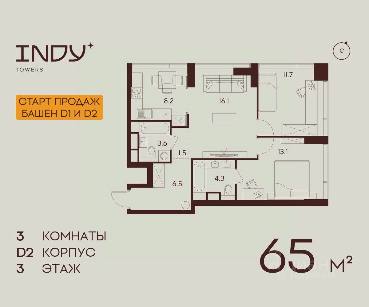 Продажа от застройщика. Продается просторная 3-комнатная квартира на 3 этаже жилого комплекса Indy Towers. Срок сдачи: 3 кв. 2029 г.