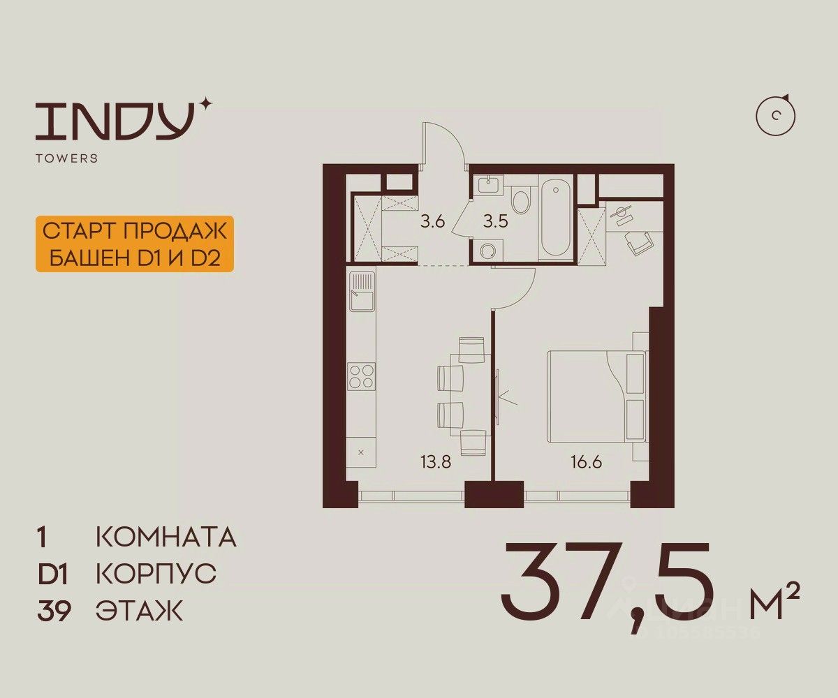 Продажа от застройщика. Продается уютная однокомнатная квартира на 39 этаже жилого комплекса Indy Towers. Срок сдачи: 3 кв. 2029 г.