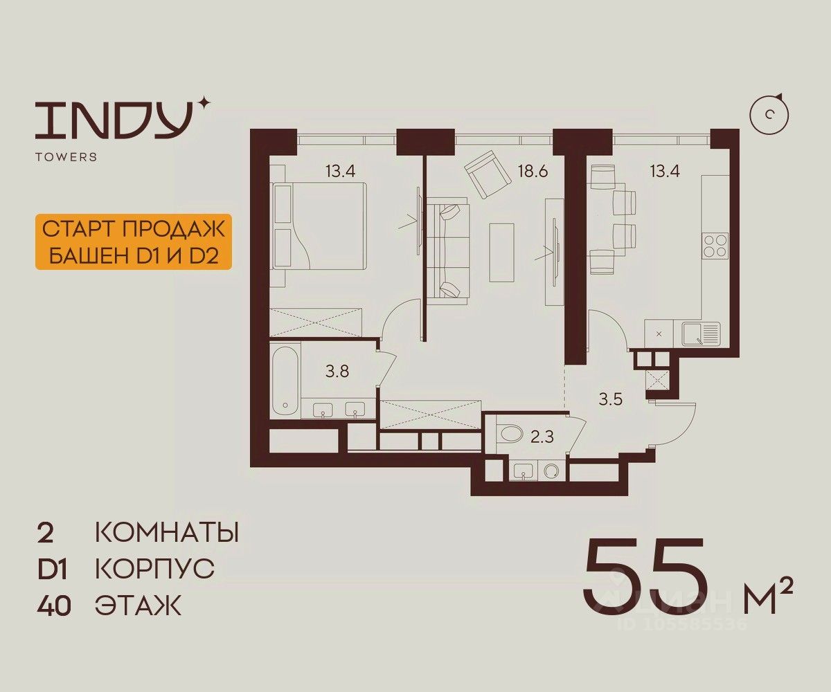 Продажа от застройщика. Продается 2-комнатная квартира на 40 этаже жилого комплекса Indy Towers. Срок сдачи: 3 кв. 2029 г.