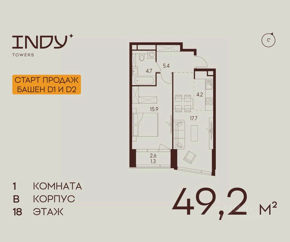 Продажа от застройщика. Продается уютная однокомнатная квартира на 18 этаже жилого комплекса Indy Towers. Вид из окон: во двор. Срок сдачи: 4 кв. 2026 г. Квартира с лоджией.