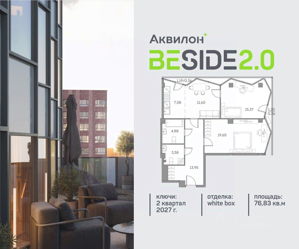 Продажа от застройщика. Продается просторная 2-комнатная квартира на 5 этаже современного жилого комплекса Beside 2.0. Вид из окон: на улицу. Срок сдачи: 2 кв. 2027 г.
