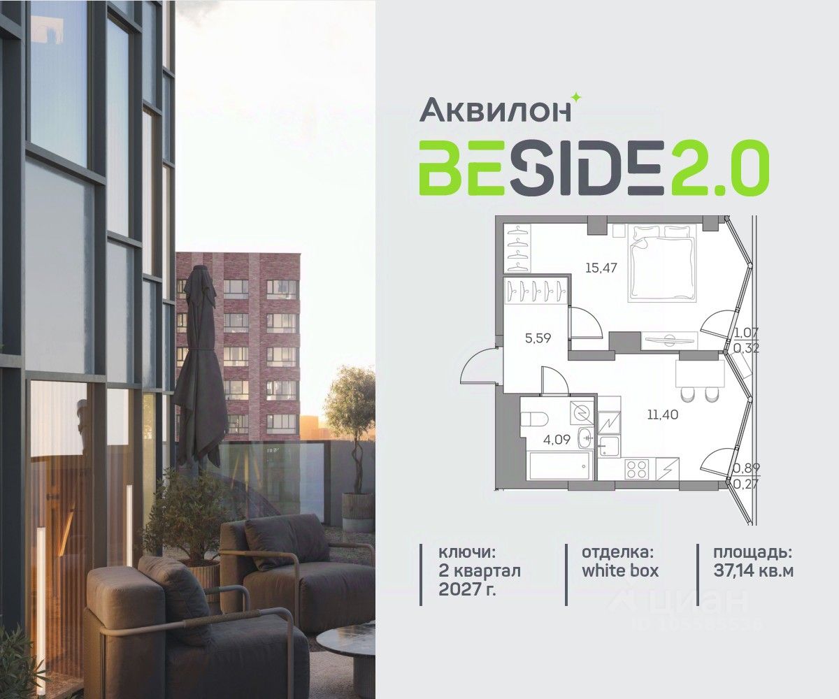 Продажа от застройщика. Продается уютная однокомнатная квартира на 7 этаже современного жилого комплекса Beside 2.0. Вид из окон: на улицу. Срок сдачи: 2 кв. 2027 г.