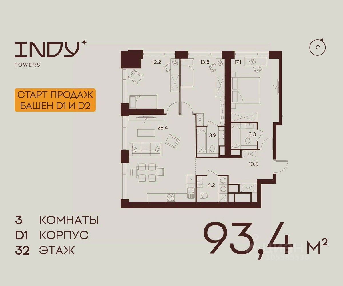Продажа от застройщика. Продается просторная 3-комнатная квартира на 32 этаже жилого комплекса Indy Towers. Срок сдачи: 3 кв. 2029 г.