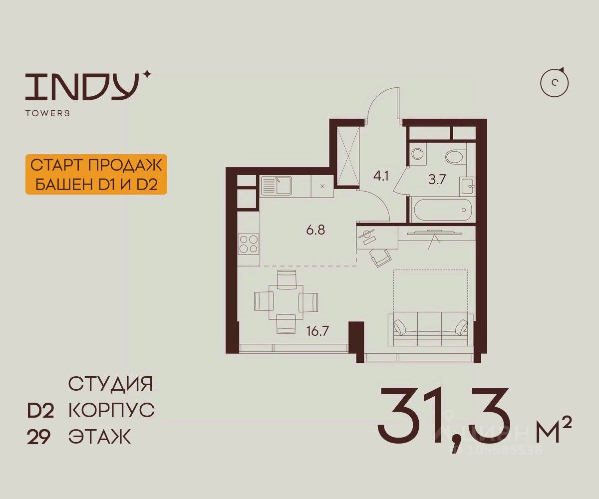 Продажа от застройщика. Продается просторная студия на 29 этаже жилого комплекса Indy Towers. Срок сдачи: 3 кв. 2029 г.