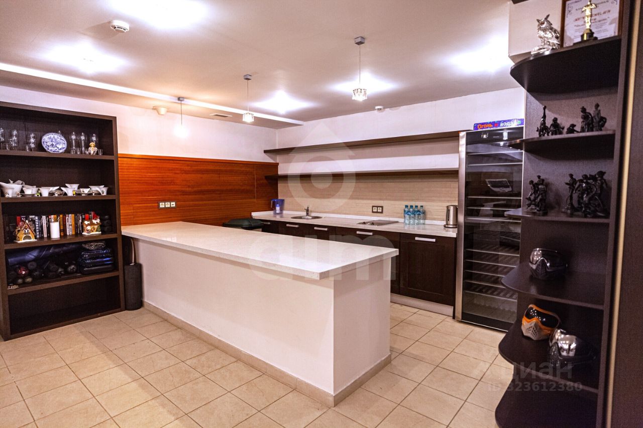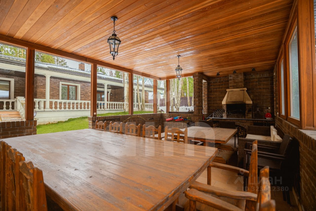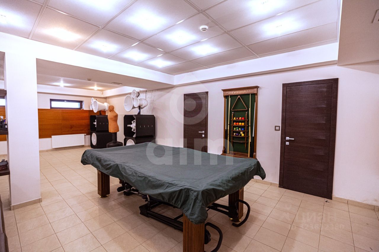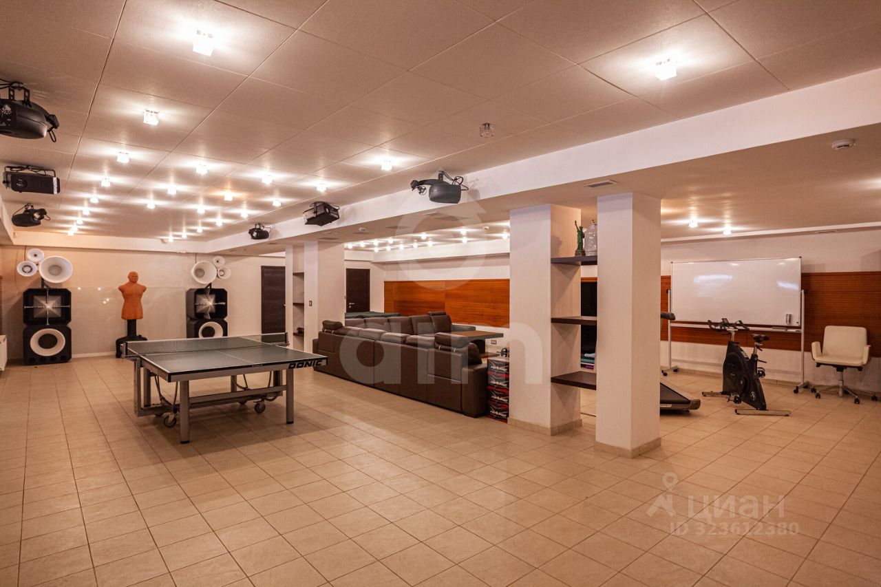 Цокольный этаж: свободное помещение с кухней и санузлом. На участке расположены крытый спортзал, беседка с зоной барбекю, хозяйственные постройки, детская площадка.