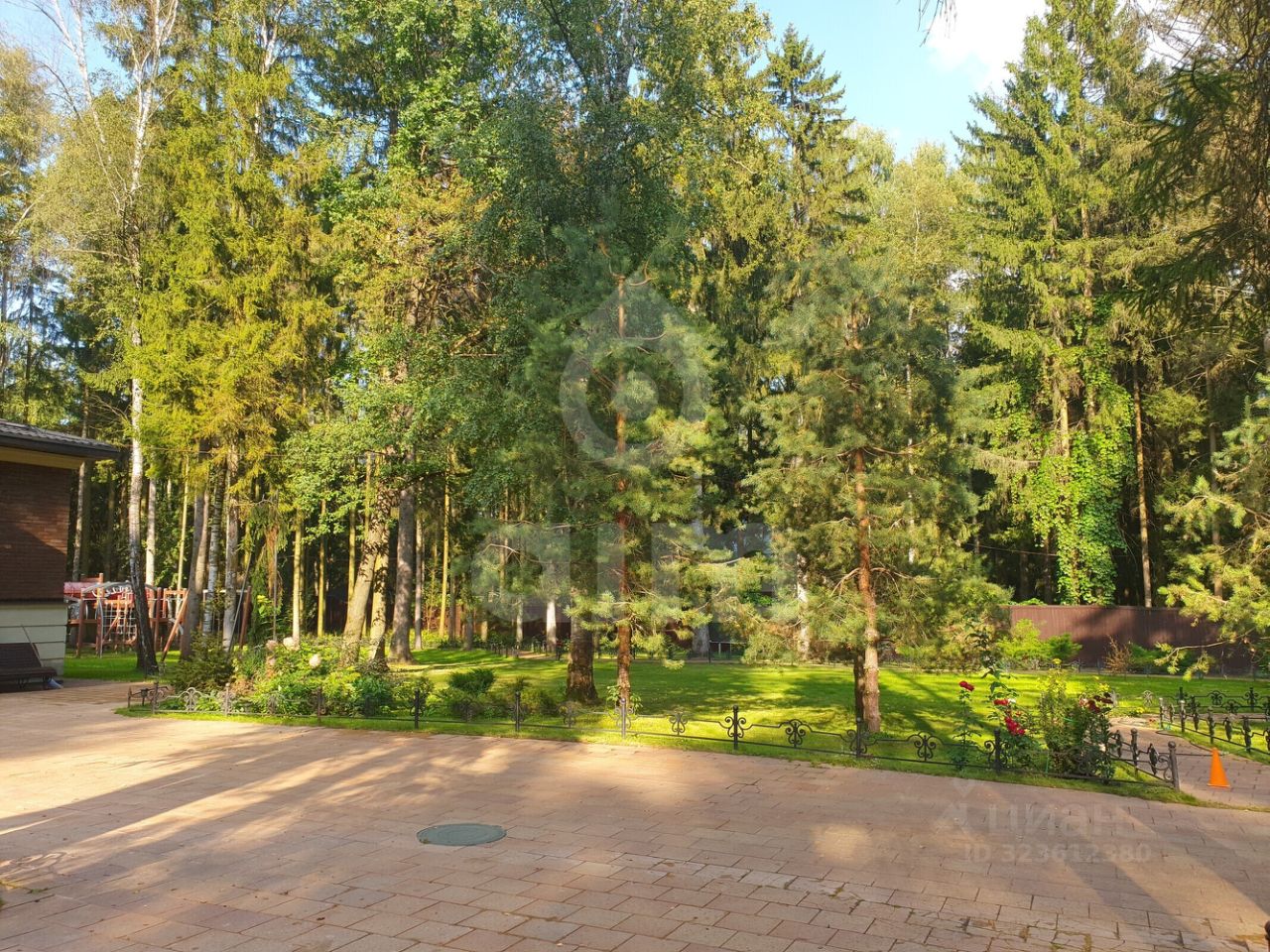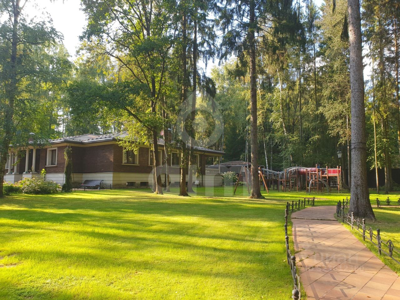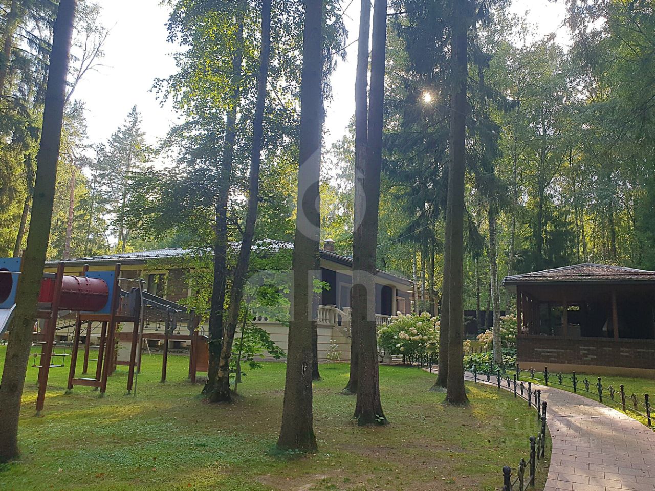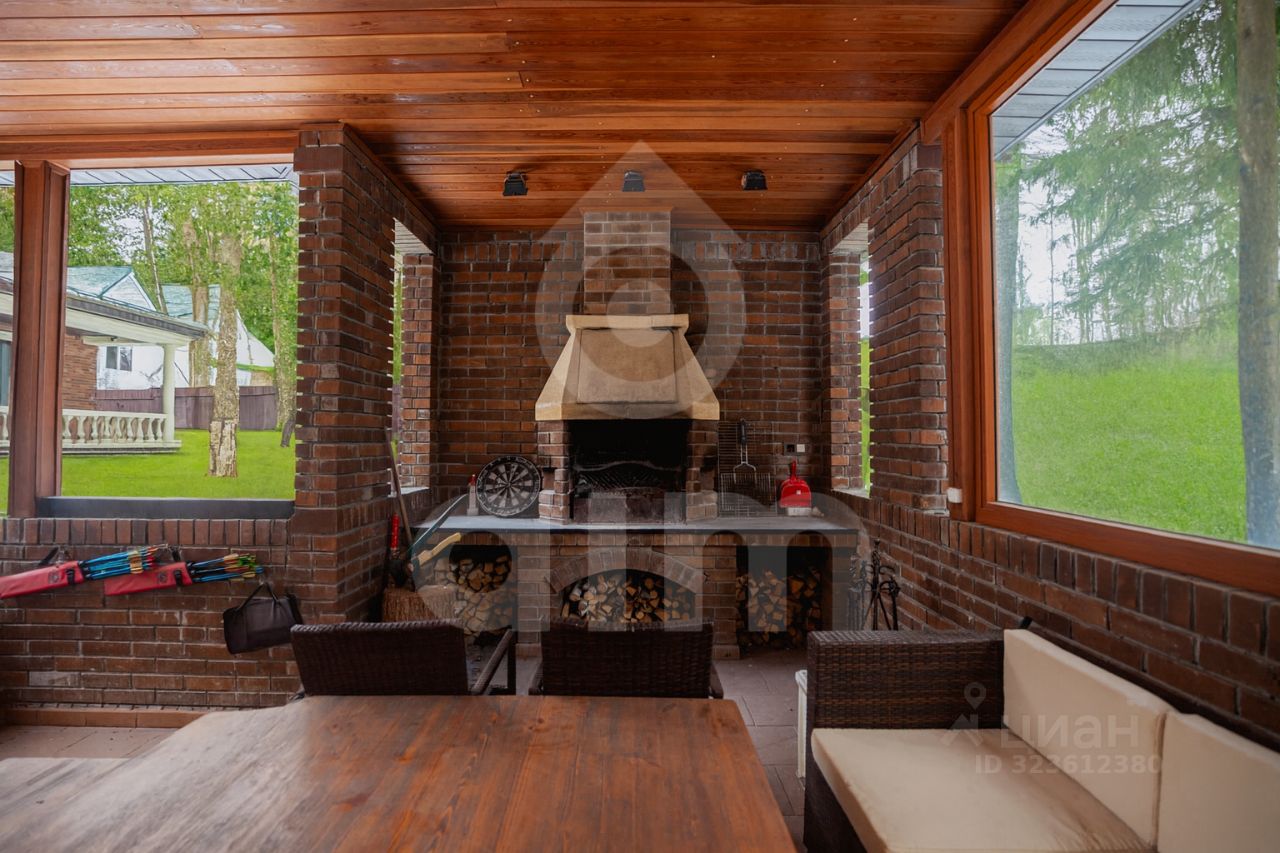 Цокольный этаж: свободное помещение с кухней и санузлом. На участке расположены крытый спортзал, беседка с зоной барбекю, хозяйственные постройки, детская площадка.