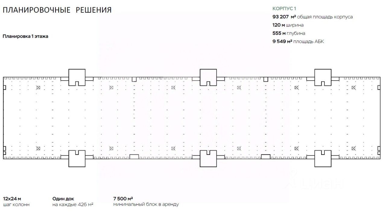 Технические характеристики: Нагрузка на пол: 6 т/кв. м Количество ворот: 180 шт. (Докового типа) Температурный режим: Отапливаемый склад Мощность: 9 000 кВт Высота потолка: 12 м Пол: Бетон-Антипыль Строится, доступ с 13.01.2026