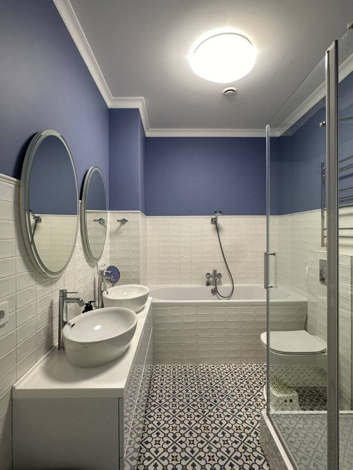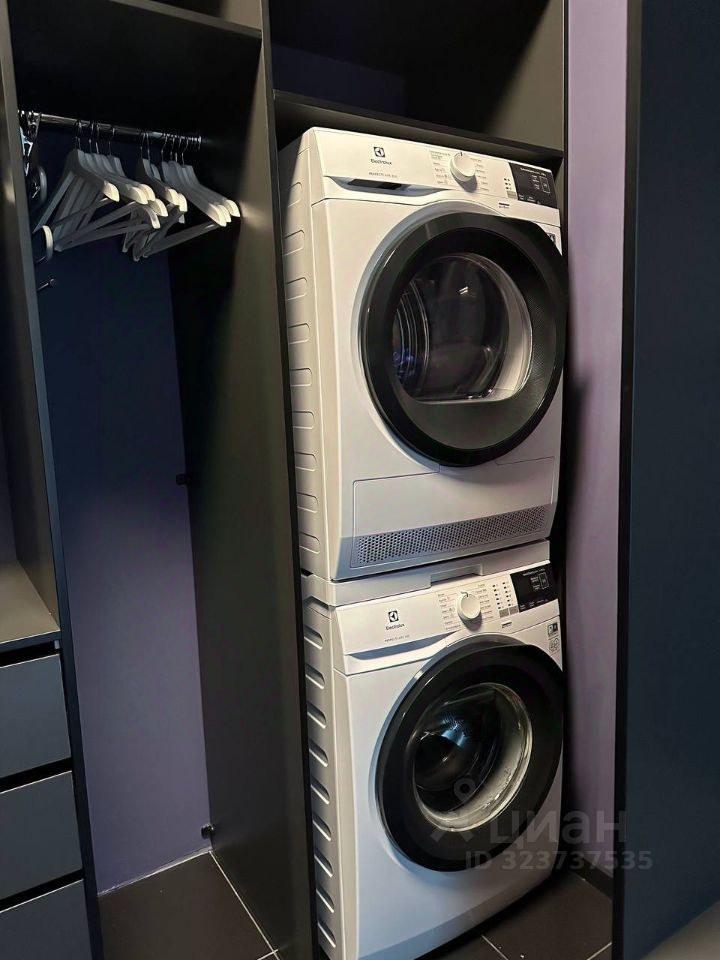 В квартире установлена современная техника: посудомоечная машина, духовой шкаф, стиральная и сушильная машины.