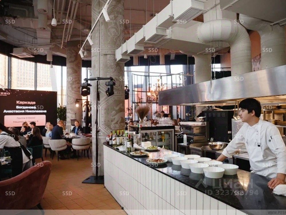 Технические характеристики: Помещение расположено на 1 этаже 15-этажного БЦ класса ''А'' общей площадью 245 кв.м, Размещение вывески на фасаде здания. Вход с фасада и из мест общего пользования. Подземный паркинг на 370 машиномест. Большие витрины. Высота потолков 6 метров. Окна на всю высоту помещения. 2 входа. Стяжка, керамогранит. Ремонт. Электрическая мощность 120 кВт. Общеобменная и технологическая вытяжка. Система чиллер-фанкойл общей мощностью 50 кВт.