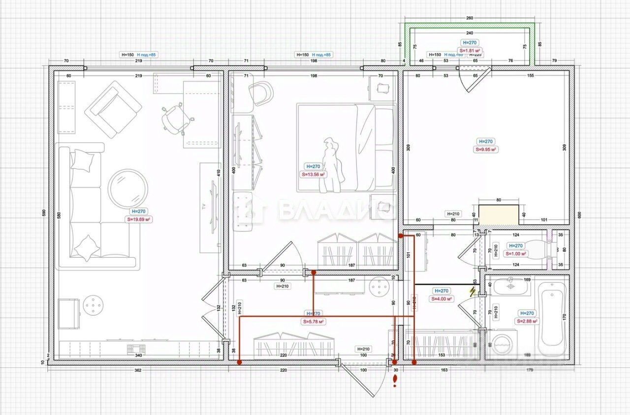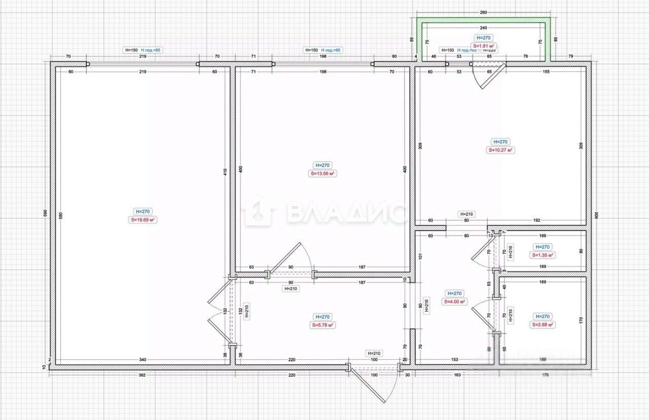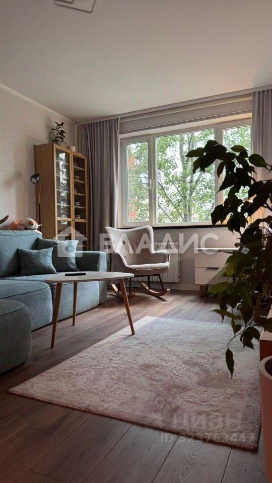 Квартира расположена на втором этаже 22-этажного кирпично-монолитного дома 1998 года постройки. Общая площадь — 57,6 кв. м, жилая — 33 кв. м, кухня — 10 кв. м. Изолированные комнаты, окна выходят на улицу.