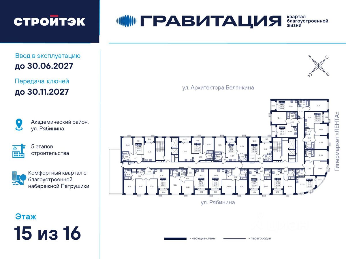 Удачные решения Новый квартал благоустроенной жизни ''Гравитация'' мы разместили в периметре улиц Рябинина и Академика Ландау. У квартала 5 этапов строительства, а всю работу мы завершим к 2030 году. Авторы проекта гармонично совместили в оформлении природные элементы и современный дизайн. Волнообразные очертания на стенах вдохновлены силой ветра и движением воды. Скруглённые углы подчеркивают элегантный силуэт, а контрастная палитра акцентов и контурная подсветка верхних этажей создают выразительный архитектурный образ. Первый этап строительства: — Секция 1.1 — 1 подъезд 26 этажей — Секция 1.2 — 2 подъезда 16 этажей — Секция 1.3 — 1 подъезд 12 этажей Здесь всё и сразу Гравитация — уютный и обособленный, и в то же время открытый и просторный квартал. Всё рядом: супермаркеты и парки, кино и рестораны, школы и сады. В нескольких шагах набережная реки Патрушихи. В квартале построят муниципальный детский сад на 200 мест, а на 5 этапе строительства мы возведём 6-уровневый надземный паркинг на 250 машин. На первых этажах домов для вас будет работать торговая галерея с магазинами, кафе и привычными бытовыми сервисами. В 1 этапе строительства 631 квартира. Своя вселенная Развитый Академический район удобен и молодым семьям, и школьникам, и состоявшимся профессионалам. Рядом большой Преображенский парк с озером и Юго-Западный лесопарк с Тропой здоровья. — 3 минуты до Гипер Ленты — 10 минут на машине до ТРЦ ''Академический'', 15 минут до ЕКАД, 25 до центра — 6 школ и 6 детских садов — Спортивные комплексы и клубы Wake up, Bright Fit и Юность Богатые возможности В квартале два просторных закрытых двора общей площадью 1,4 гектара. Один двор объединяет 1 и 2 этапы строительства, другой — 3, 4 и 5 этапы. Между дворами — камерная прогулочная аллея для неспешных вечеров или полуденного отдыха. Во дворе первого этапа — зелёные участки из хвойных деревьев, акцентных кустарников и травянистых многолетников, а также сеть дорожек, детская площадка с песочницей, аттракционами и геопластикой, настольный теннис и зона для зарядки. А для комфорта и безопасности — вечернее освещение, охрана и постоянное видеонаблюдение. Пространство с заботой В просторных светлых лобби Гравитации — интеллигентный дизайн, помещения для колясок, высокие витражи и комфортная мебель. Выходы сквозные, на улицу и во двор. Лифты грузоподъёмностью 1000 и 450 кг. Мы подготовили для вас 44 уникальных варианта продуманных планировок, в том числе с кухнями-гостиными, гардеробными и мастер-спальнями. Здесь нет бесполезных зон, зато есть где посидеть в семейном кругу и разместить всё для удобства и комфорта. Современные технологии Мы позаботились о достойной чистовой отделке, чтобы вы могли уделить время главному. — Виниловые обои на флизелиновой основе, окрашенные стены в санузлах и на лоджиях — Натяжные потолки везде, кроме лоджий, там — окрашенные — Прочный влагостойкий ламинат и керамическая плитка — Межкомнатные двери светлых тонов и сейф-дверь на входе — Эргономичное размещение розеток и выключателей
